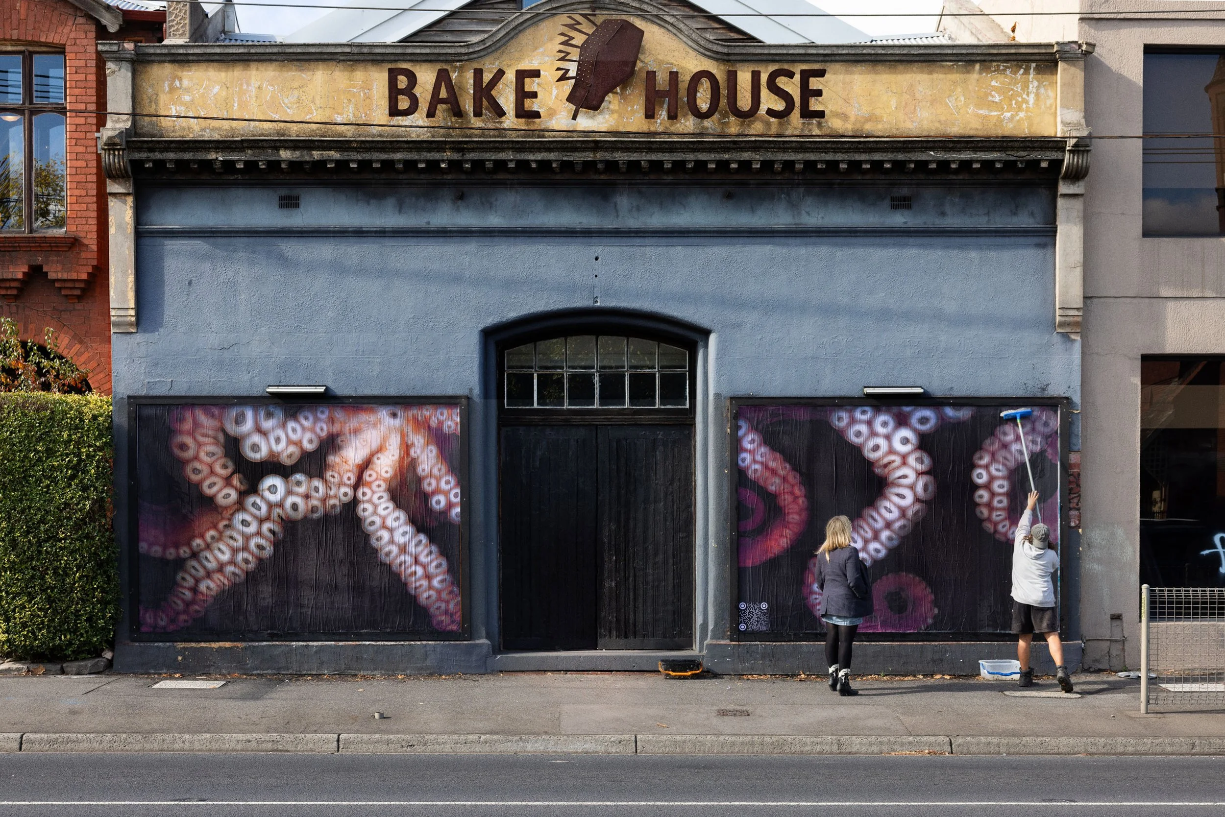 What happens when a giant telepathic cephalopod from hell takes revenge on Hoddle Street's stormwater drains and perpetrators of pollution, and why wouldn’t you? In Amanda Morgan’s new exhibition, the flatbed is an intentionally inappropriate stage to amplify ocean “naturecultures” for Oceanic Care, presenting tangible recuperation and, with each sucker and tentacle, raising climate response-ability during a pressing time of ecocide. The project is part of the larger Scanimalia PhD research, which seeks to animate stories of making and caring well, and with more-than-human aquatic beings and their lively, touchy-feely senses, where their blue-green blood and three hearts are staying with a strong present tense. The research proposed a tentacular intervention on The Bakehouse Public Art Project. The Bakehouse Public Art Project was launched in 2014 to support artists with activated, highly visible, large-scale billboard installations. The exhibition wall faces onto Hoddle Street, Australia’s busiest arterial road, where 10,000 cars pass by per hour (equivalent to 2 million motorists per week). They slow down for the traffic lights and to take in the public art installations.
